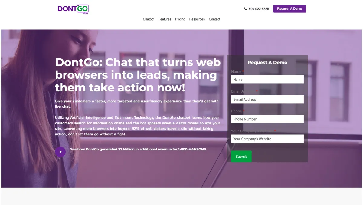 DontGo est la division de start-up de logiciels entrepreneuriale d’une société mère Business to Consumer très établie de 100 millions de dollars. La technologie brevetée de DontGo réinvente Chat en utilisant l’IA pour résoudre la façon dont les entreprises convertissent leurs visiteurs Web en clients et transforment les impressions Web en revenus en améliorant considérablement l’interaction et la satisfaction des clients.